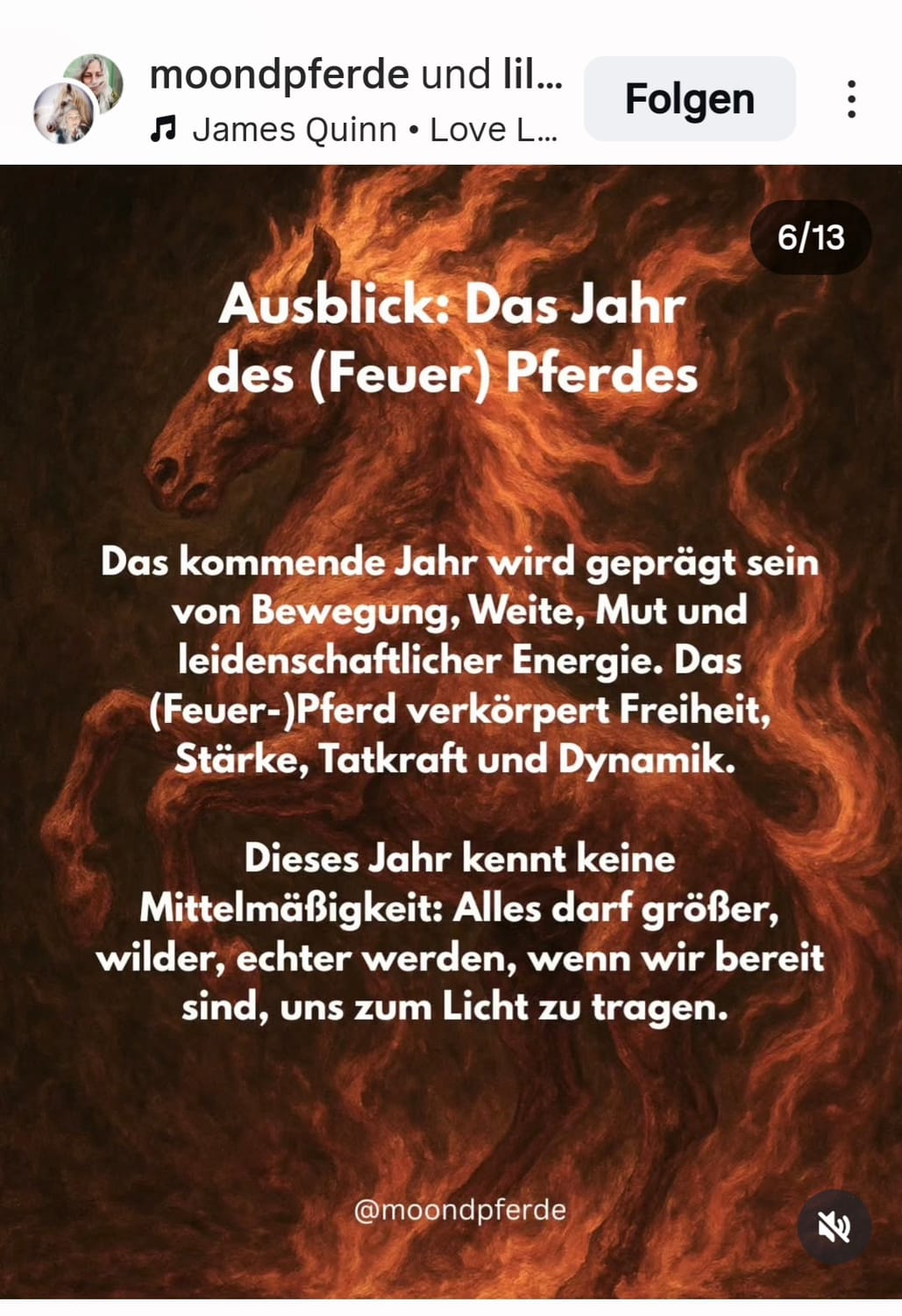 Für mich beschreibt das Feuerpferd ein Jahr, in dem ich mich weniger absichern und mehr auf mein Bauchgefühl verlassen möchte. Nicht alles braucht einen Plan bis ins letzte Detail. Manches darf einfach beginnen. Klar, mit Haltung und ohne endloses Hin und Her.