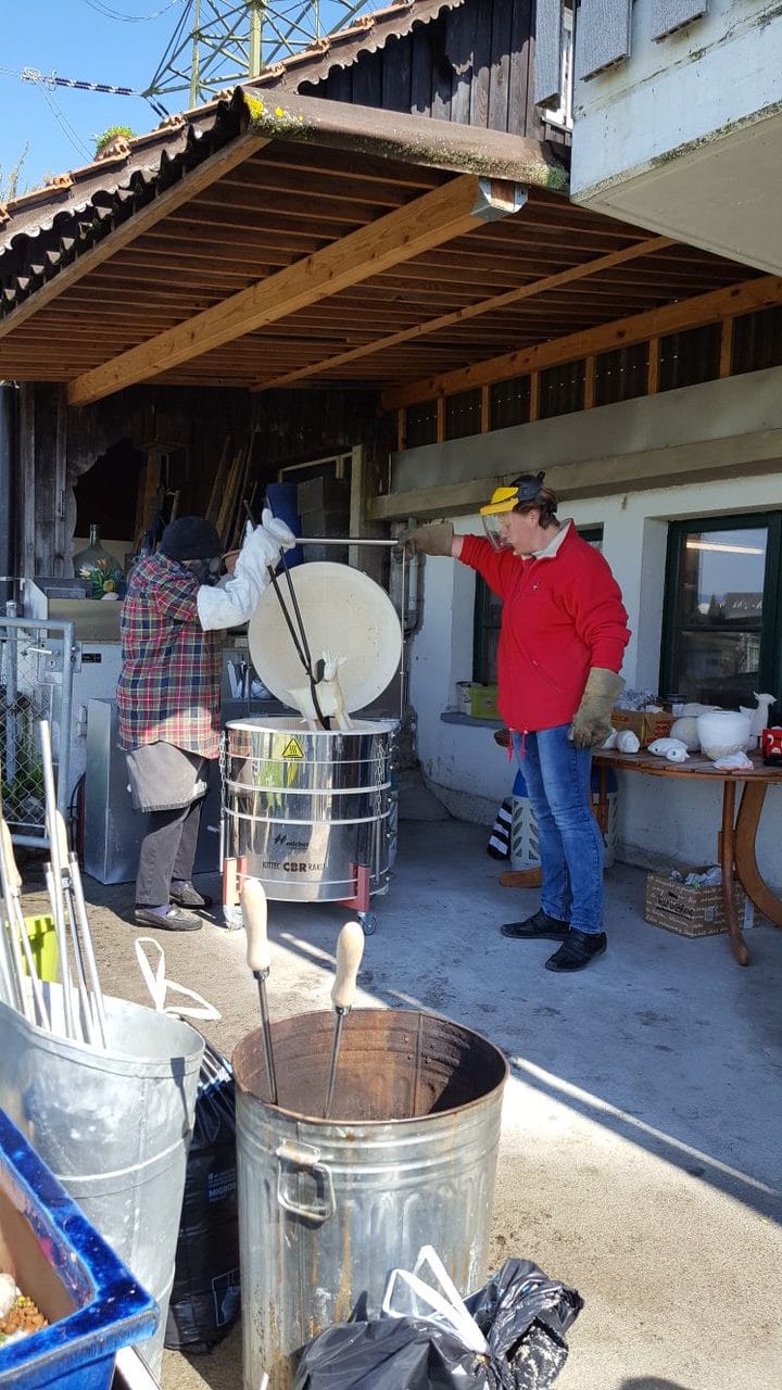 Nach dem Brennen kommt die noch glühende, 1000°C heisse Keramik in ein reduzierendes Umfeld. Ich kenne die Methode mit Holzspänen.