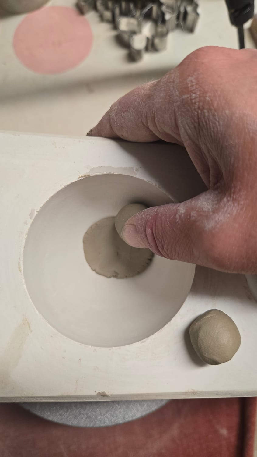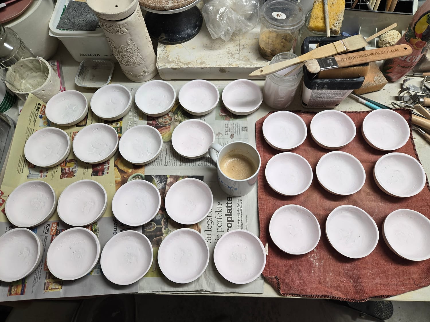 Meist habe ich Platten ausgerollt, Kreise ausgeschnitten und diese in die Gipsform gelegt. Antrocknen lassen. Weiterarbeiten. Warten. Wiederholen.