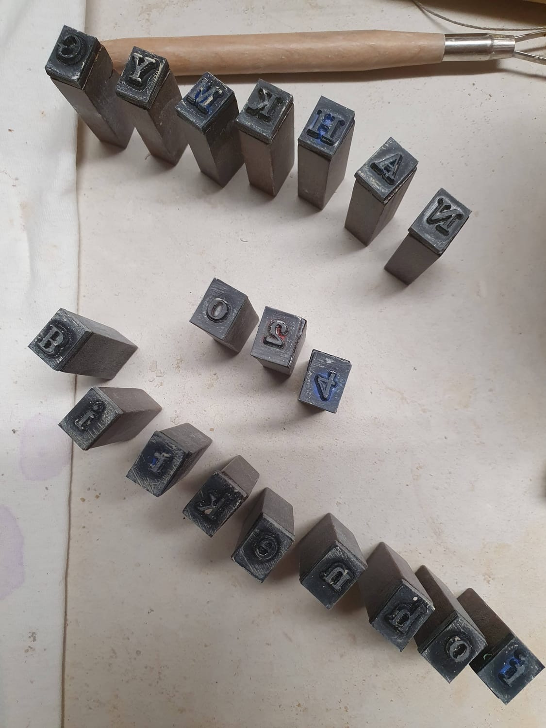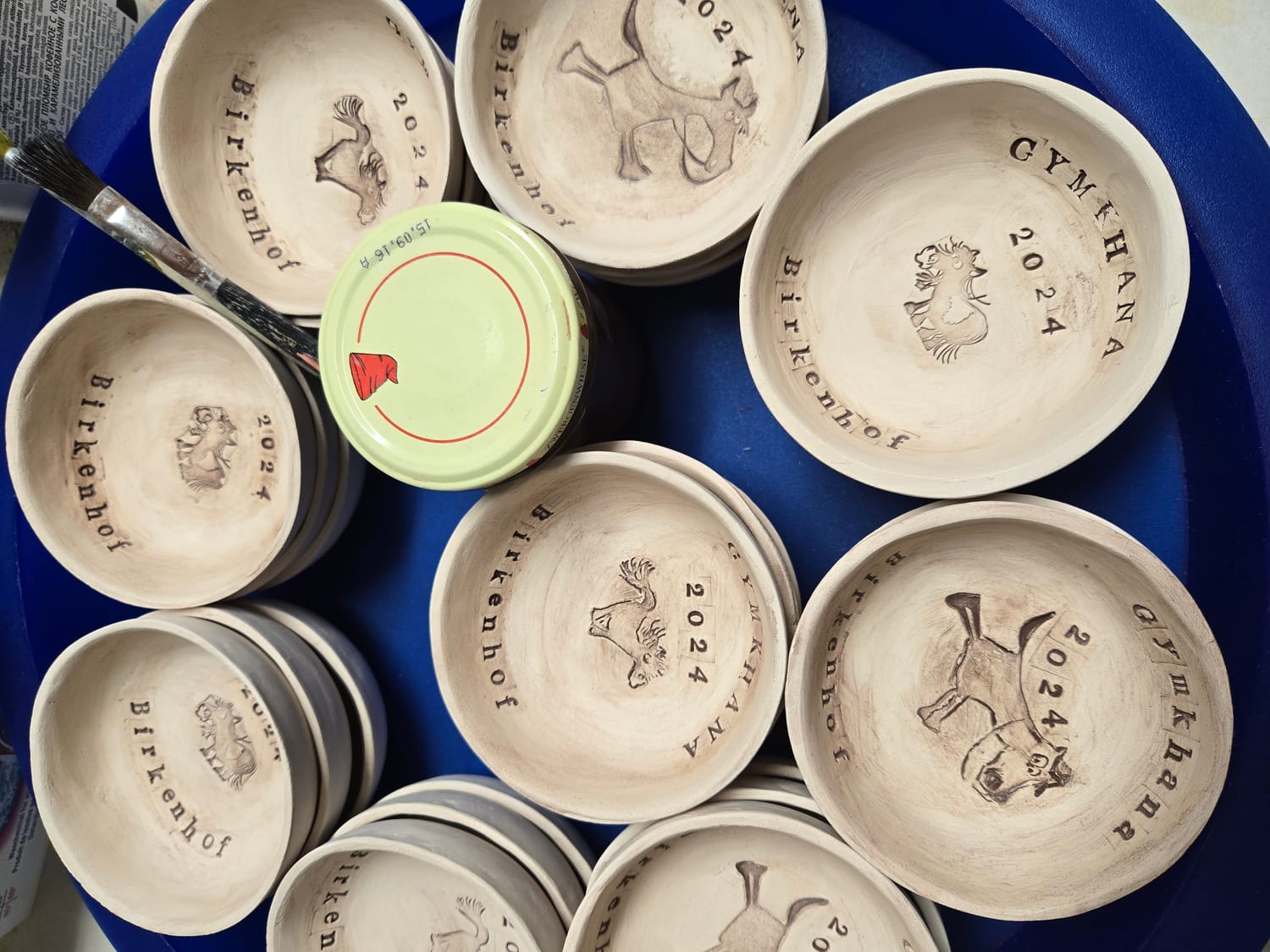 Die Abstände der Buchstaben musste ich abschätzen – meist nahm ich einfach das vorherige Schälchen als Vorlage. Manche Buchstaben sitzen etwas höher oder tiefer. Auch die Pferdestempel sind mal stärker, mal feiner ausgeprägt. Sichtbar. Und genau so gedacht.